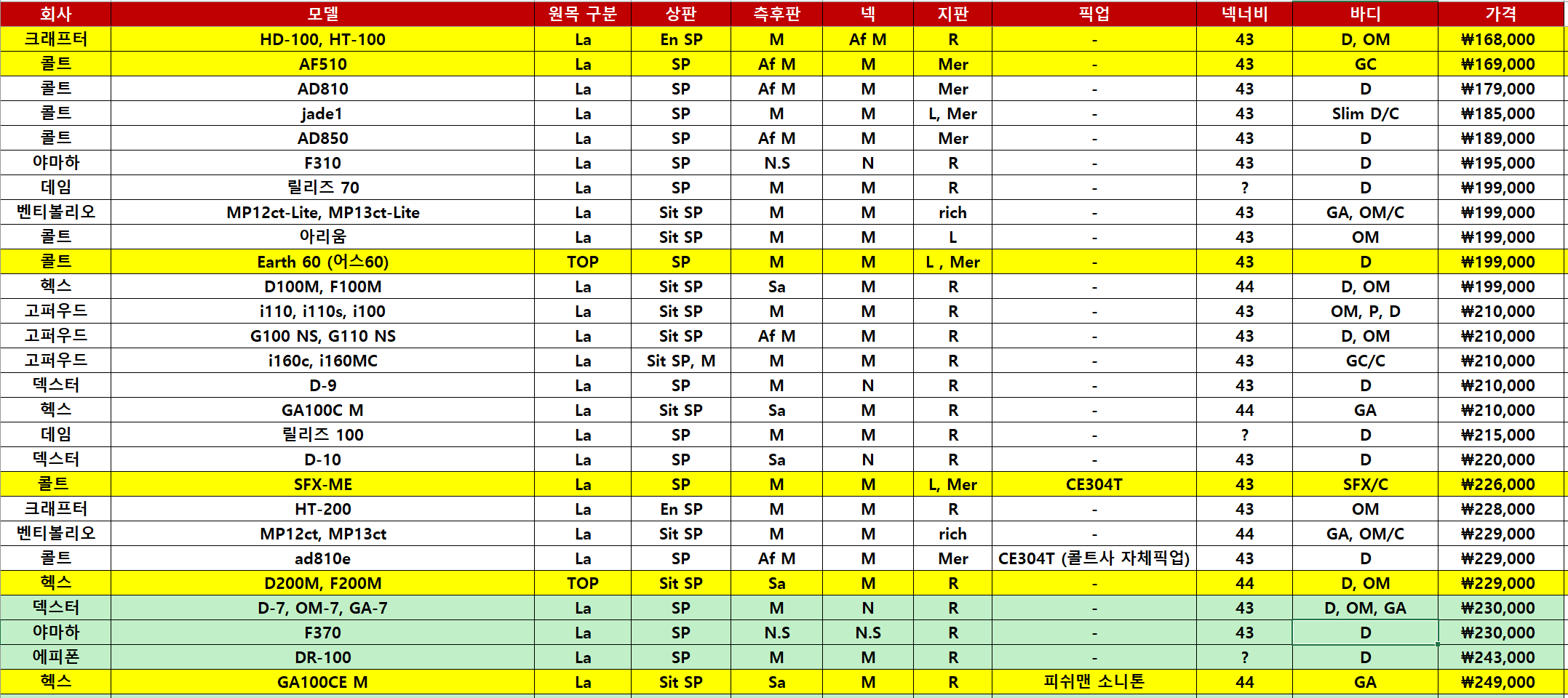2025.08.17 / 수정 - 수정내용 크래프터의 신제품, 라이트 시리즈를 추가했습니다. 이것은 크래프터 전 제품 스펙 비교표에도 있습니다. 추가한 이유는 20만원-30만원대 기타에 설명해놓았습니다. 이제 이 기타 이후로 저는 가격대비 스펙에 있어서 만큼은 콜트의 어스와 루체 시리지를 추천하지 않기로 했습니다.... 다시 한번 강조드리는 것은 오직 가격대비 스펙 면에서만 비교했을 때 입니다!-------------- 어쿠스틱 기타 관련 블로그를 운영하며, 너무 산발적인 정보들을 한 눈에, 알아보기 쉽게 가격대별로 스펙을 비교할 수 있도록 정리해야 겠다는 생각을 했습니다. 과거 통기타 관련 회사에서 잠깐 일을 하며 정리했던 경험을 살려 엑셀 파일에 우리가 보통 알고 있는 어쿠스틱 기타(통기타)들의 스펙..