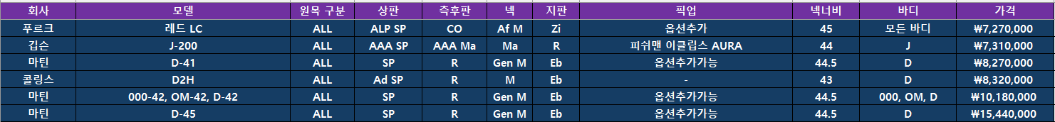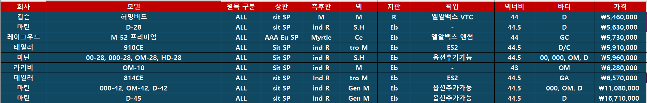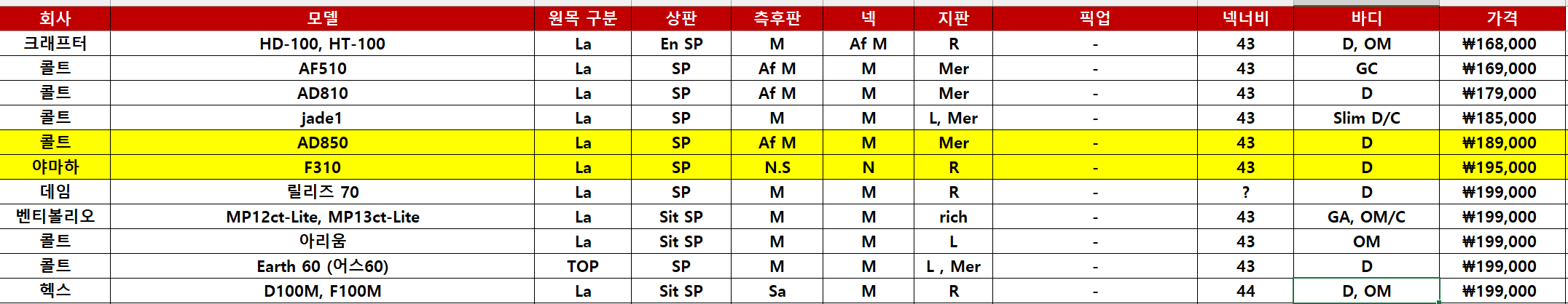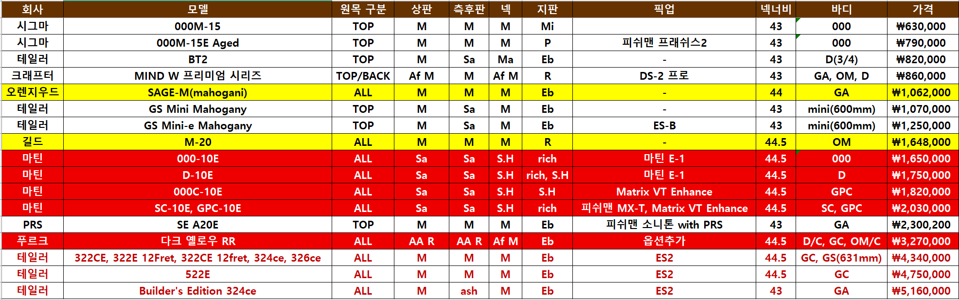 2025.08.17 / 수정 - 수정내용 크래프터의 신제품, 라이트 시리즈를 추가했습니다. 이것은 크래프터 전 제품 스펙 비교표에도 있습니다. 추가한 이유는 20만원-30만원대 기타에 설명해놓았습니다. 이제 이 기타 이후로 저는 가격대비 스펙에 있어서 만큼은 콜트의 어스와 루체 시리지를 추천하지 않기로 했습니다.... 다시 한번 강조드리는 것은 오직 가격대비 스펙 면에서만 비교했을 때 입니다!-------------- 어쿠스틱 기타 관련 블로그를 운영하며, 너무 산발적인 정보들을 한 눈에, 알아보기 쉽게 가격대별로 스펙을 비교할 수 있도록 정리해야 겠다는 생각을 했습니다. 과거 통기타 관련 회사에서 잠깐 일을 하며 정리했던 경험을 살려 엑셀 파일에 우리가 보통 알고 있는 어쿠스틱 기타(통기타)들의 스펙..